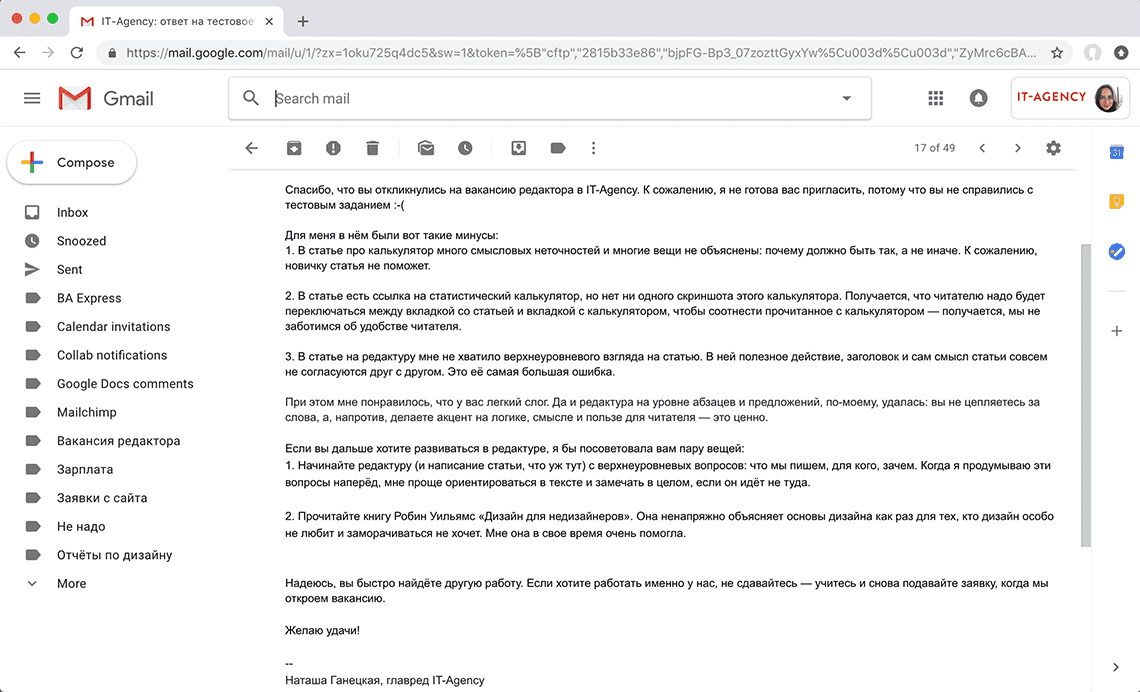 Вообще не отвечать — не вариант, послать стандартную отписку «Извините, вы нам не подходите» — тоже, поэтому я писала развёрнутые ответы каждому. Часть письма с отказом была шаблоном, но для каждого человека я его заполняла по-разному.