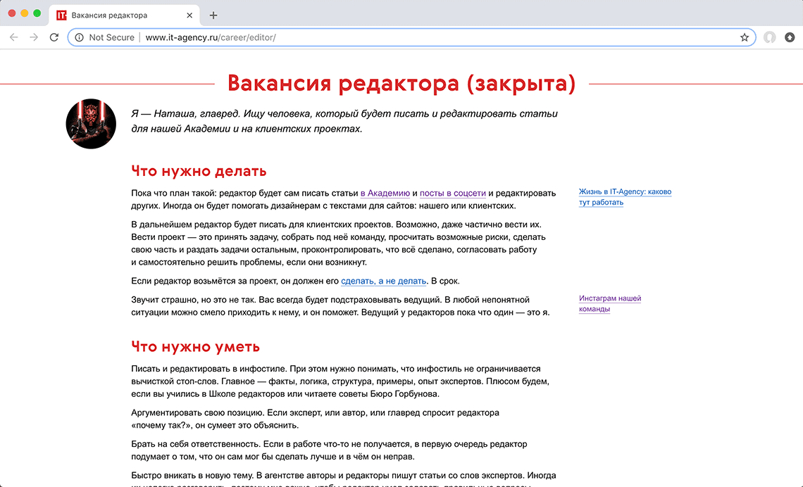 Вакансия состояла из шести блоков, к которым хотелось привлечь внимание:
