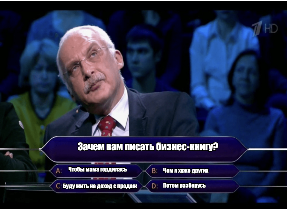 Часто бизнес-книги пишут, чтобы удовлетворить личные амбиции, повысить себе самооценку и быть круче сына маминой подруги. А по факту книга не несет никакой пользы для читателя — нет новой информации или годных идей, а только бесконечное самолюбование. Это ок, если хочется просто увидеть свою фамилию крупным шрифтом на обложке или подарить по экземпляру родственникам и коллегам. А те, возможно, даже прочитают книгу — из вежливости.