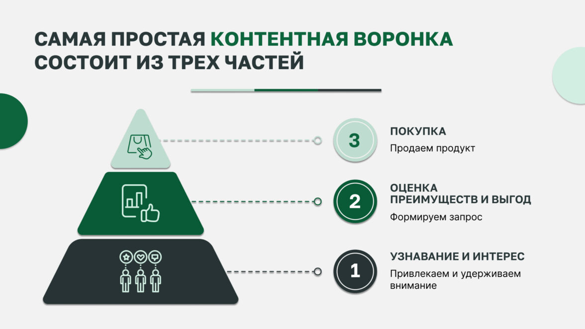Самая простая воронка состоит из трех частей ― узнавание и интерес, оценка преимуществ и выгод, непосредственно покупка.