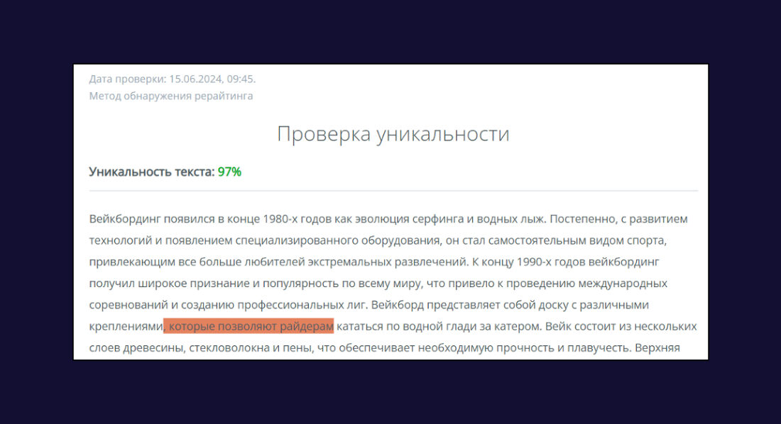 В нашем случае уникальность составила 97 %, что означает отличный результат. Обычно мы стараемся писать тексты с уникальностью выше 92 %.