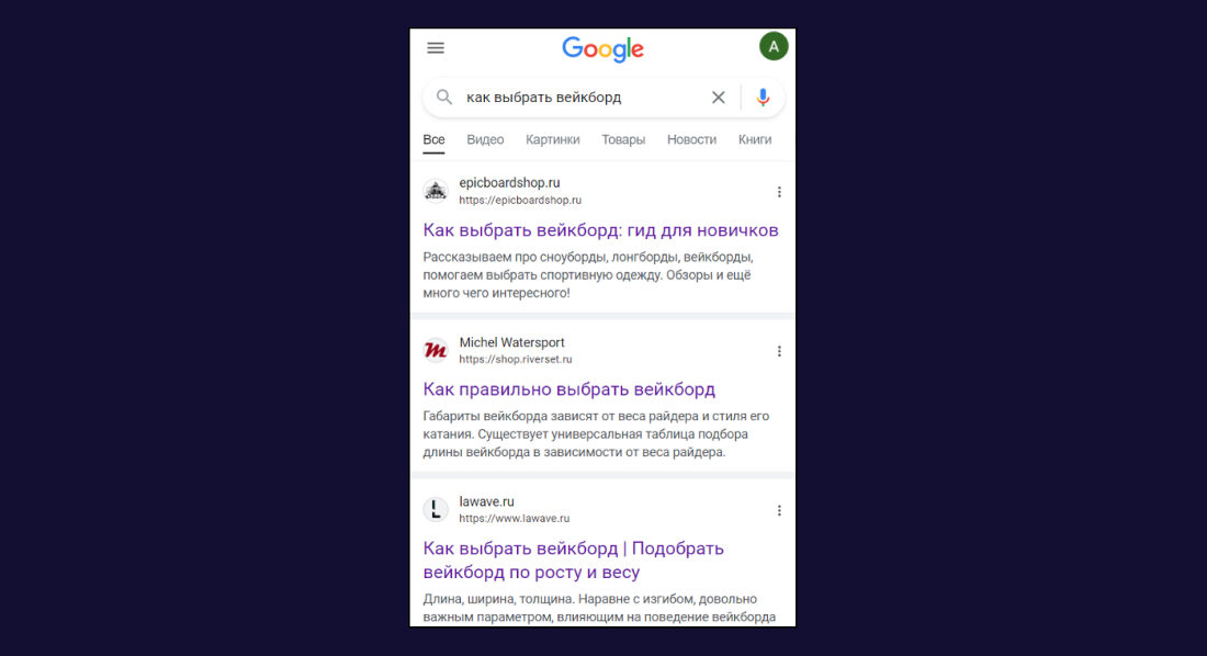 Как и всегда, мы начинаем написание статьи со сбора семантики и создания плана: мы расписываем структуру текста и заголовков. Удобным для нас способом мы собираем ключевые фразы по нашей теме и список 4–5 релевантных статей конкурентов из ТОП-10 в Google и «Яндекс». Для примера возьмём случайную тему «Как выбрать вейкборд».