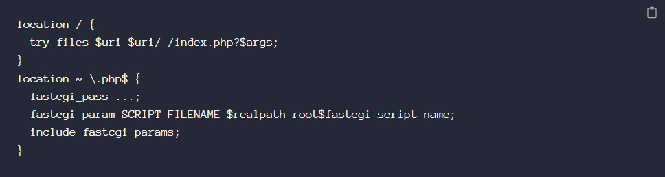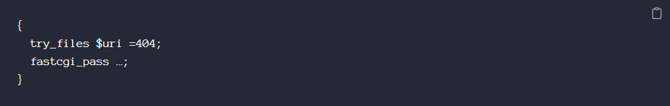 Директива try _files выполняется слева направо, то есть при запросе сначала проверяется доступность файла из запроса – и, при его наличии, он будет отдан. Это базовый функционал веб-сервера, но таким образом можно извне прочитать различные файлы конфигурации в папке приложения, файлы версий Composer, .bak, .sql и т. д., о которых разработчик не задумывается.