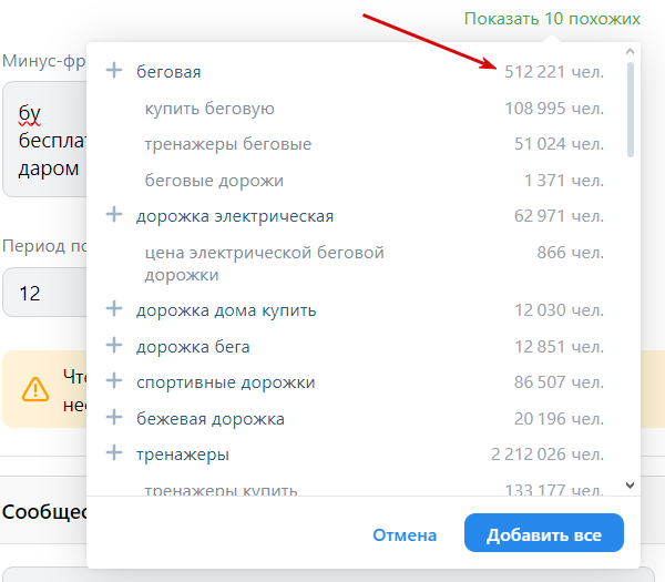 Рядом с фразами появятся прогнозируемые охваты.