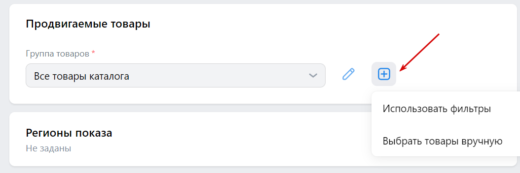 2. Выберите товары для продвижения. По умолчанию выбран весь каталог. Чтобы добавить фильтры или отметить нужные товары вручную, нажмите на плюсик.