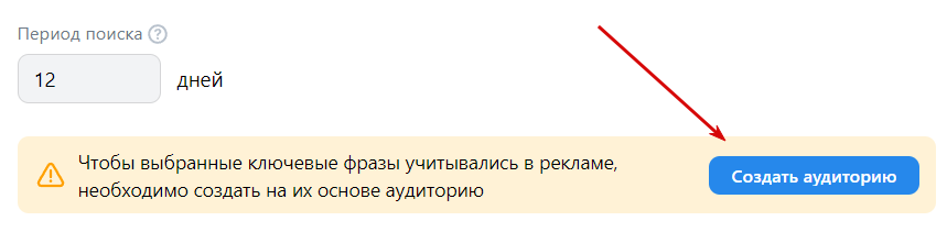 Когда настроите ключевые слова, создайте на их основе сегмент аудитории. Кнопка появится в этом блоке сразу после добавления запросов.