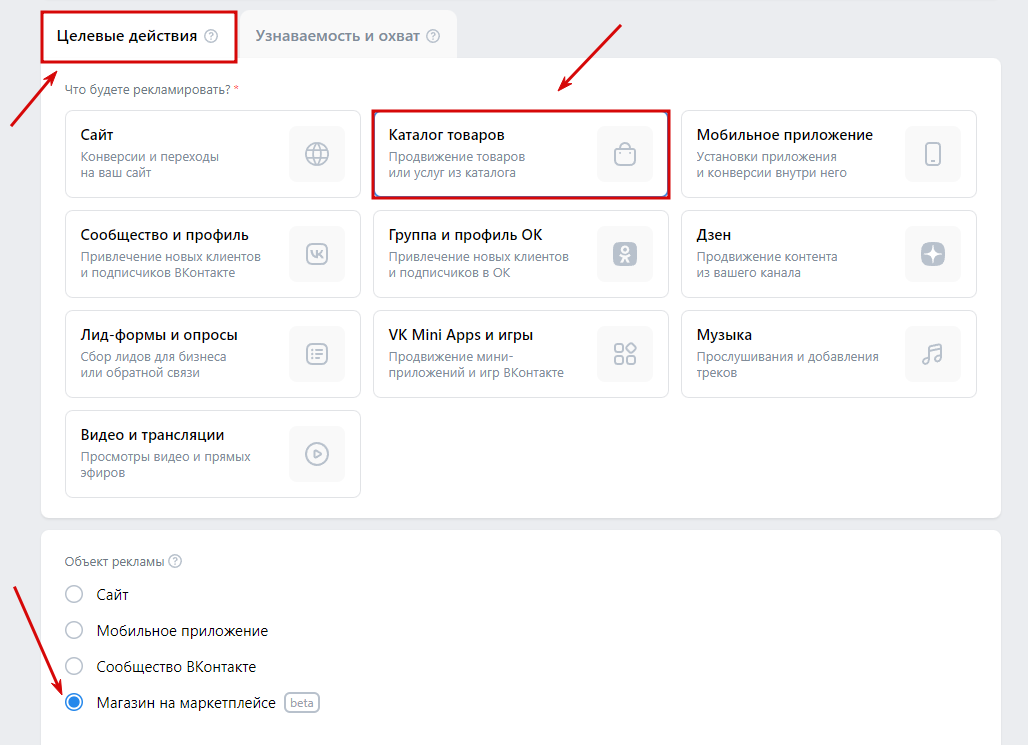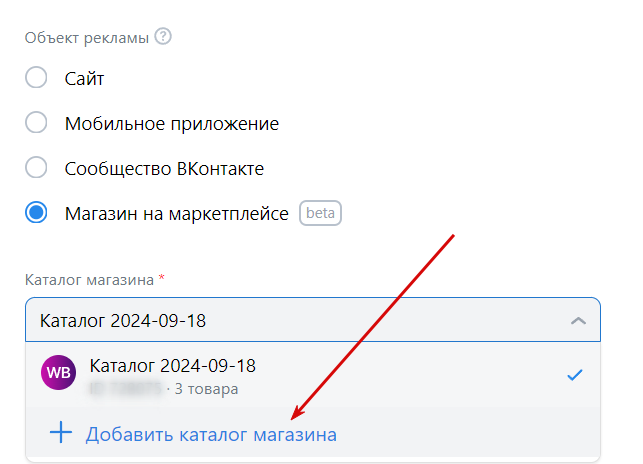 1. Добавьте новую кампанию в кабинете VK Ads, дайте ей название. В качестве рекламного объекта выберите «Каталог товаров» → «Магазин на маркетплейсе» во вкладке «Целевые действия».