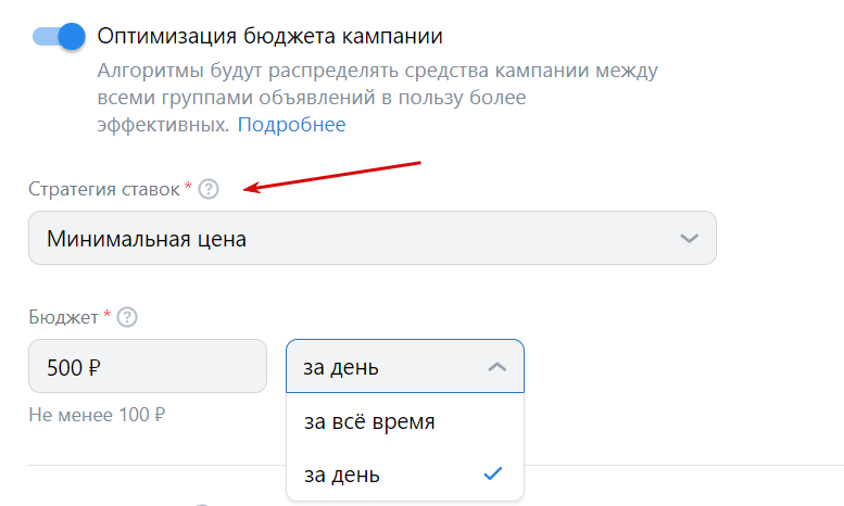 6. Укажите стратегию ставок — минимальная или предельная цена. VK Ads рекомендует ставить минимальную цену. По этой стратегии алгоритм старается получать как можно больше конверсий в пределах заданного бюджета. Например, вы установили дневной бюджет в размере 500 рублей. Система постарается получить максимальное количество кликов или просмотров (в зависимости от того, что вы выбрали в качестве CPA) в рамках этой суммы за один день.