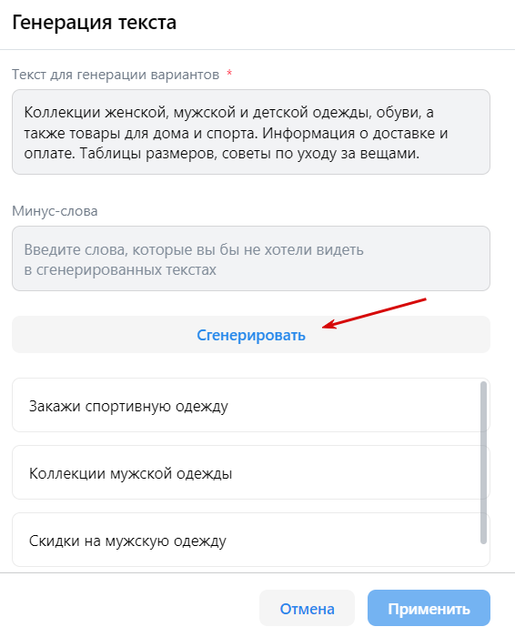 Введите текст, на основе которого нейросеть создаст заголовок или описание. Нажмите «Сгенерировать» и примените нужный вариант.