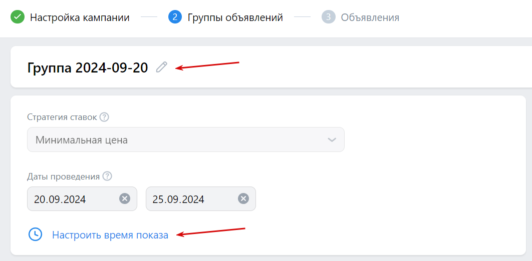 1. Дайте название группе и настройте время показа объявлений. Для каждой группы можно указать свои сроки показов, но только в рамках периода действия кампании. Например, кампания может работать с 18 по 25 сентября, а конкретная группа с 20 по 25 сентября.