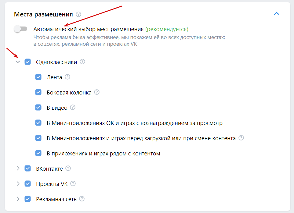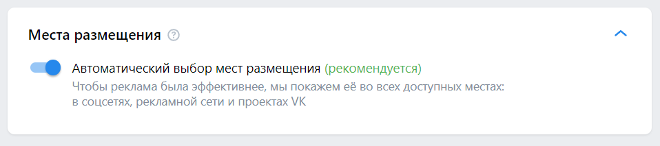 7. Настройте места размещения. Рекомендуемая настройка VK Ads — автоматический выбор мест.