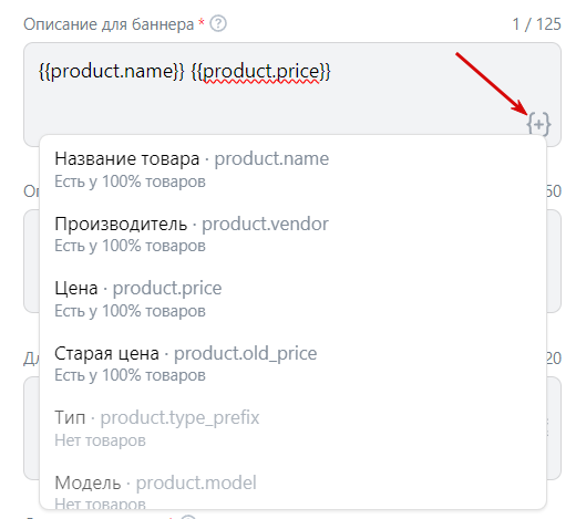 Далее укажите тексты описаний для баннера и карусели. Описание баннера можно сформировать с помощью макросов, чтобы система автоматически подставляла в него информацию о товаре.