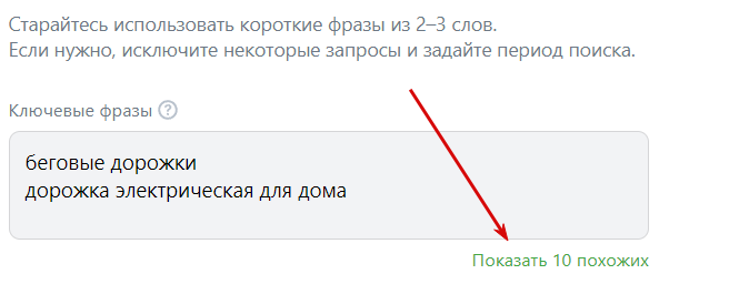 Рядом с полем «Ключевые слова» появится ссылка на похожие запросы. Нажмите на нее, чтобы найти и добавить дополнительные ключи, которые вы могли упустить.