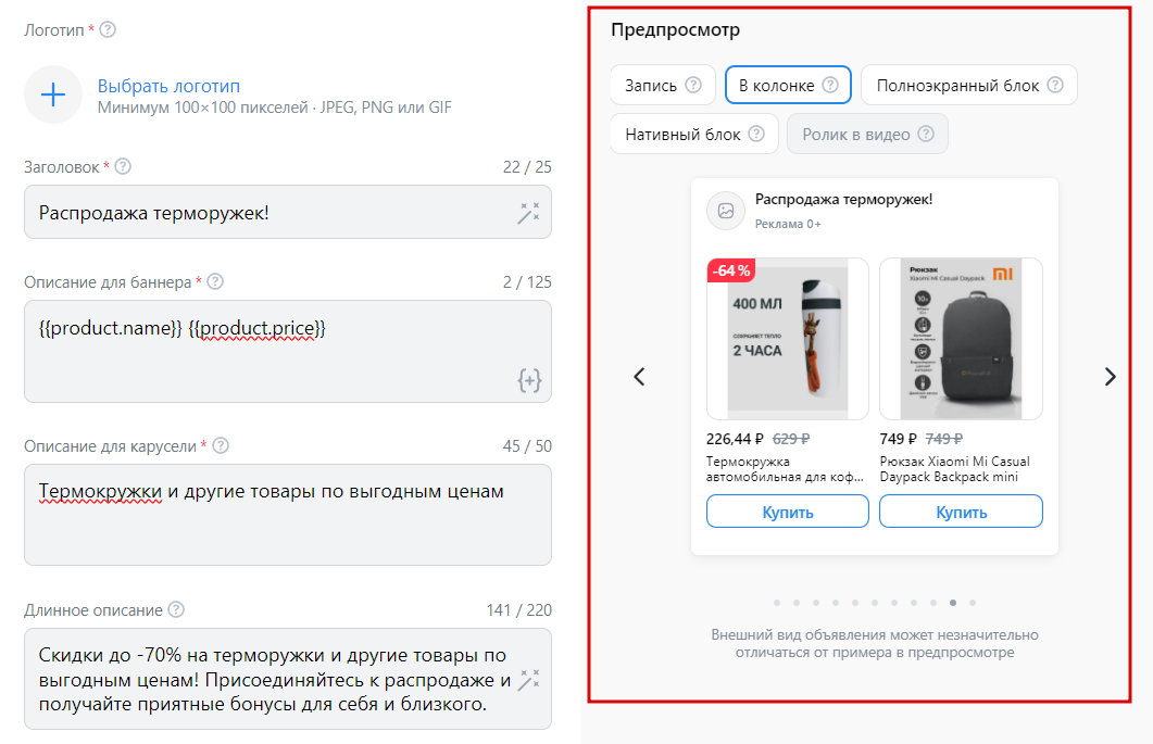 Объявления для товаров настраиваются почти так же, как и реклама других типов. Сначала загрузите логотип магазина размером не менее 100х100 пикселей. Если не добавить его, VK Ads покажет логотип Wildberries.