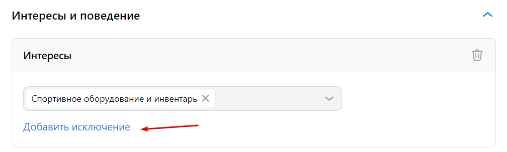 Интересы. Нажмите на пустое поле, чтобы развернуть список доступных вариантов. Выберите одну или несколько тематик, которыми интересуются потенциальные покупатели. Можете добавить исключения, чтобы не показывать рекламу пользователям с определенными интересами.