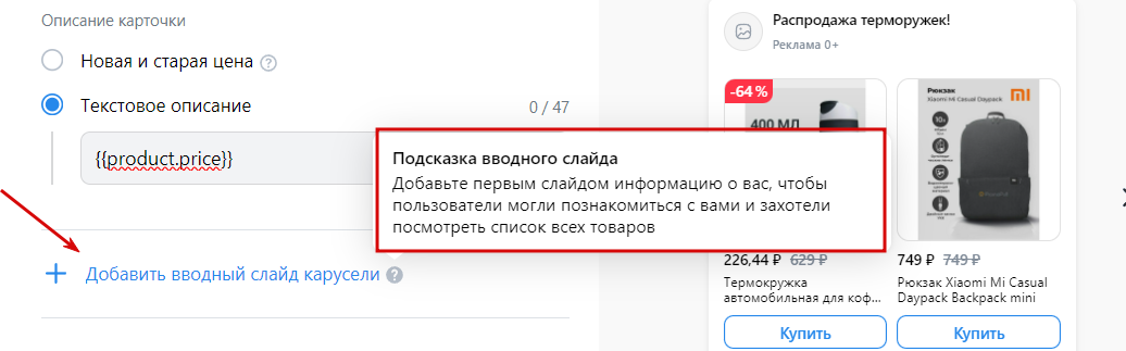 Для описания карусели добавьте свой текст длиной до 50 знаков, макросы использовать нельзя. Результаты изменений отслеживайте в окошке предпросмотра справа.