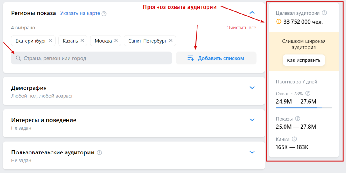 3. Укажите регионы показа объявлений. Их можно добавить по одному, сразу списком или отметить на карте. Справа находится окошко с прогнозом охвата аудитории при текущих настройках таргетинга.