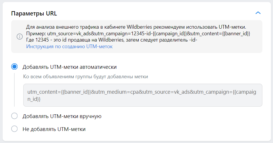 6. Добавьте UTM-метки. Они пригодятся для анализа внешнего трафика в кабинете Wildberries. В кабинете VK Рекламы видно только количество просмотров и кликов по рекламе, но нет информации о продажах. Отследить продажи пользователям, которые перешли по объявлениям, помогут UTM-метки. Инструкция по их созданию и кнопка для генерации есть в кабинете WB продвижения.