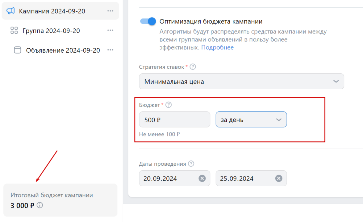 При бюджете менее 500 рублей система может превысить затраты на стоимость нескольких показов или кликов. Например, если стоит ограничение в 400 рублей, а цена клика 15 рублей, то VK Ads может потратить 415 или 430 рублей.