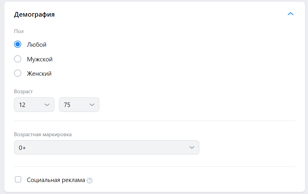 4. Настройте демографические характеристики аудитории и выберите возрастную маркировку.