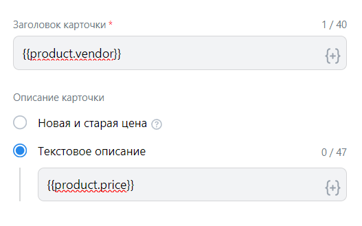 Настройте структуру заголовка и описания карточки с помощью макросов. По умолчанию используется название производителя {{product.vendor}} в заголовке и цена {{product.price}} в описании.