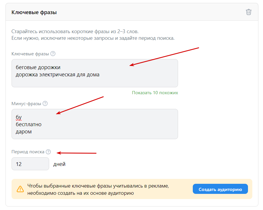 Ключевые фразы. Заполните этот блок, чтобы реклама показывалась людям, которые искали определенные товары. Укажите ключи списком и добавьте минус-фразы, чтобы отсеять нецелевой трафик. Также укажите период поиска — это количество дней, за которые будут учитываться поисковые запросы. Например, если указать 12 дней, то объявления покажутся пользователям, которые вводили этот запрос в поиске за последние 12 дней.