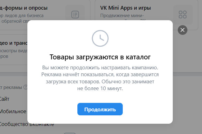 VK Ads начнет загружать информацию о товарах в каталог. Это может занять около десяти минут, в зависимости от количества позиций в магазине. Закройте окошко с оповещением, чтобы продолжить настройку кампании.