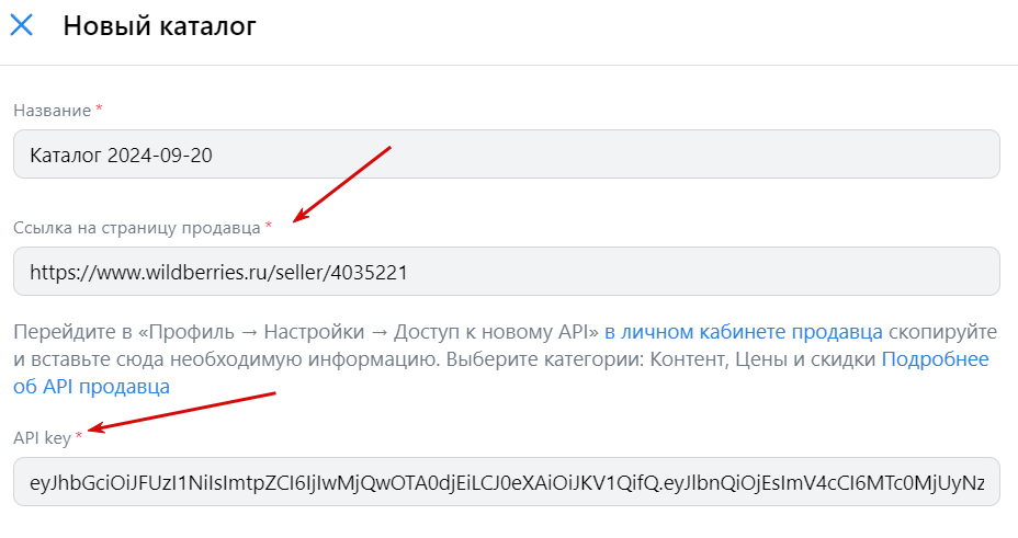 Справа появится окошко, укажите в нем название каталога, ссылку на магазин на Wildberries и API-ключ. Последний нужен для того, чтобы VK Ads могла автоматически загружать карточки из WB для создания объявлений и обновлять информацию о товарах в магазине. Как получить API-ключ в кабинете селлера WB, читайте в нашем гайде.