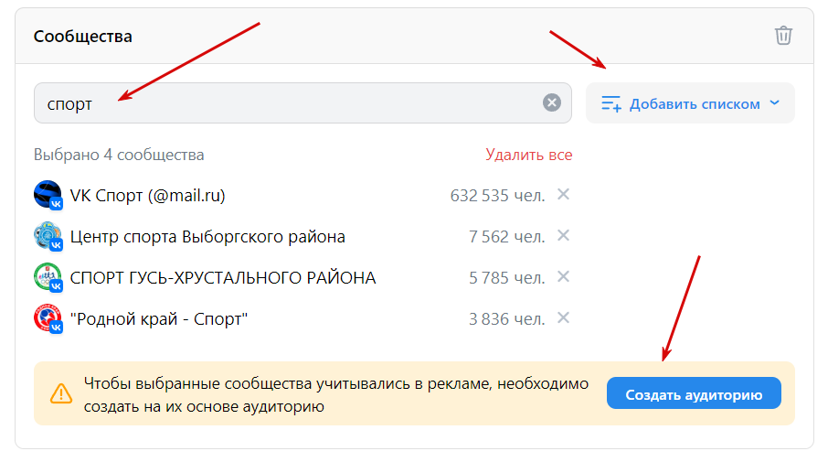 Сообщества. Укажите здесь сообщества, участникам которых хотите показывать рекламу. Добавьте ссылки одним списком или нажмите на пустое поле и начните вводить название. В выпадающем перечне выберите нужные варианты. Создайте аудиторию.