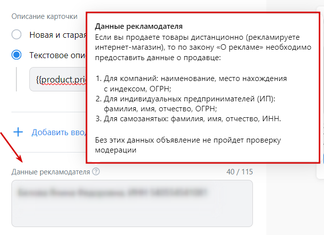 В блоке «Данные о рекламодателе» автоматически подгрузится информация о компании из кабинета VK Ads — ИНН, ОГРНИП, ОГРН, фамилия, имя и отчество, в зависимости от формы ведения деятельности.