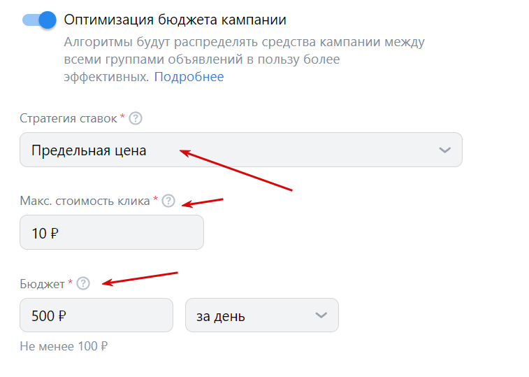 При бюджете менее 500 рублей система может превысить затраты на стоимость нескольких показов или кликов. Например, если стоит ограничение в 400 рублей, а цена клика 15 рублей, то VK Ads может потратить 415 или 430 рублей.