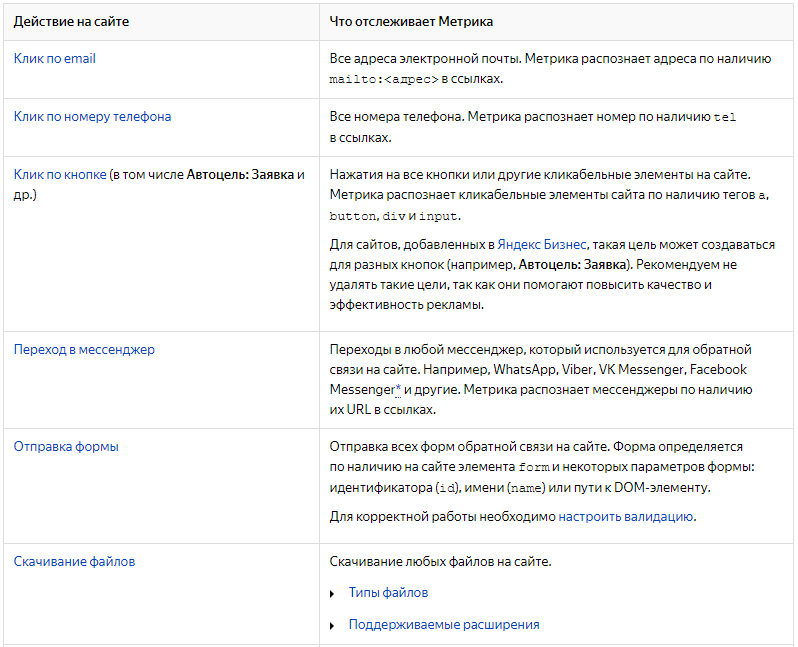 Однако, необходимо понимать, что автоцели не всегда могут корректно отслеживать события, ввиду того что каждый сайт имеет свою архитектуру, встроенные скрипты и другие особенности. Поэтому наиболее важные события (например, заказ обратного звонка, покупка и прочее) лучше настраивать вручную.