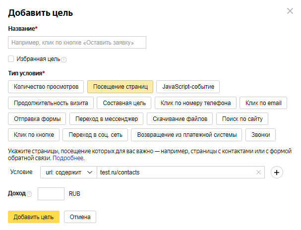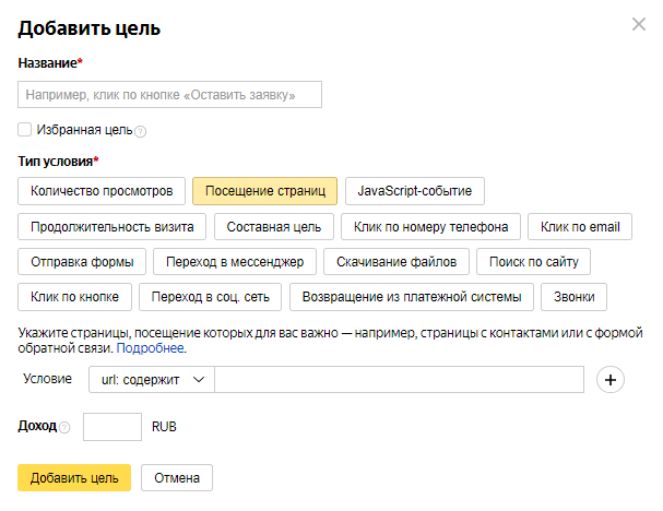 Цель посещение страниц поможет отследить визиты, в которых пользователь заходил на наиболее важные страницы на сайте — контакты, корзина и тому подобное. Эта цель также подойдет для использования в ретаргетинге в качестве микроконверсии или для показа индивидуальных объявлений в зависимости от посещенной страницы.