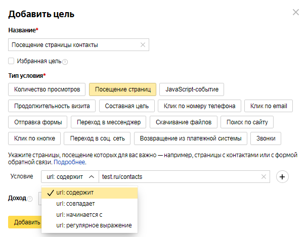 Цель фиксирует посещение определенной страницы или группы страниц, в зависимости от условия настройки. Для настройки нужно ввести название, например «Посещение страницы контакты» и указать условие по url-адресу нужной страницы/группы страниц: