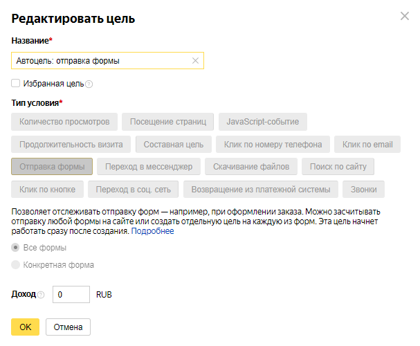 Цель фиксирует отправку формы на сайте. Можно отслеживать как отправку всех форм сразу, так и каждой по отдельности. Для настройки нужно ввести название цели (например, «Форма Перезвоните мне») и указать страницу сайта, на которой она находится (если нужна конкретная форма):