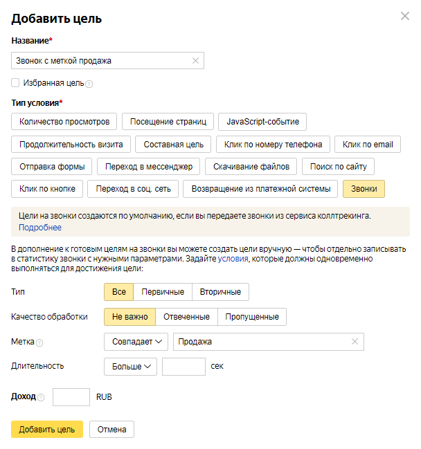В качестве условий цели можно выбрать первичность звонка, длительность или конкретную метку в коллтрекинге.