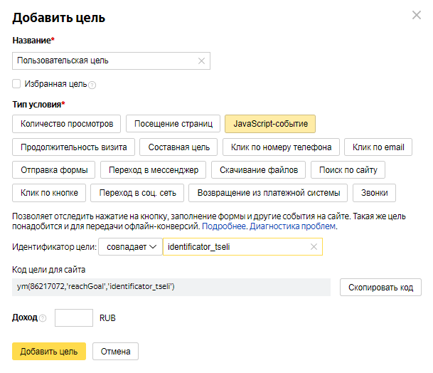 Пользовательские цели (настраиваются через тип цели «JavaScript событие»).