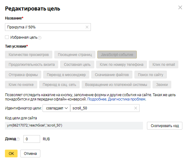 1. Задаем название цели и прописываем идентификатор для нее. Например, если мы хотим отследить событие прокрутки страницы на 50%: