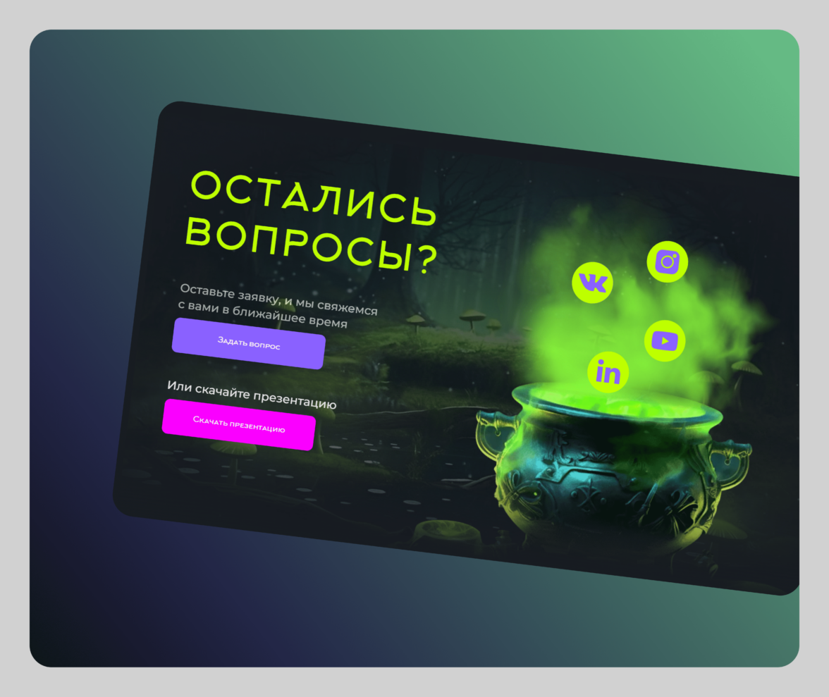 Для финального блока с контактами в ТЗ был продуман котелок, из которого с дымом выходят иконки социальных сетей. Изображение получилось сгенерировать с первого раза, за 5 минут, с помощью запроса magical seething cauldron of a witch with green smoke stands in the forest (магический котёл ведьмы с зелёным дымом, который находится в лесу).