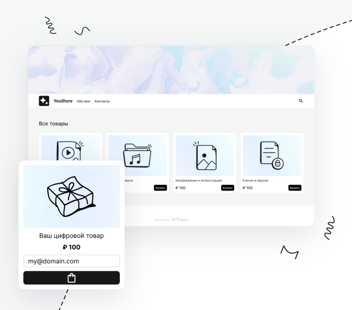 Molz — платная платформа для продажи любых типов товаров: от электронных книг до лицензионных ключей. На площадке можно встроить виджет или кнопку «Купить», создавать скидочные купоны и устраивать распродажи.