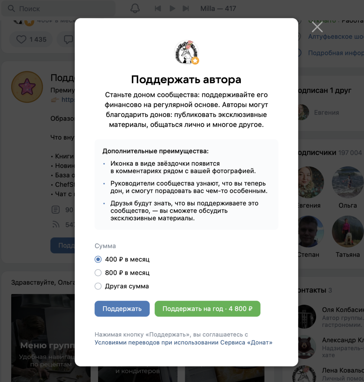 Окно для оформления «Поддержки автора» внутри авторского сообщества ВКонтакте