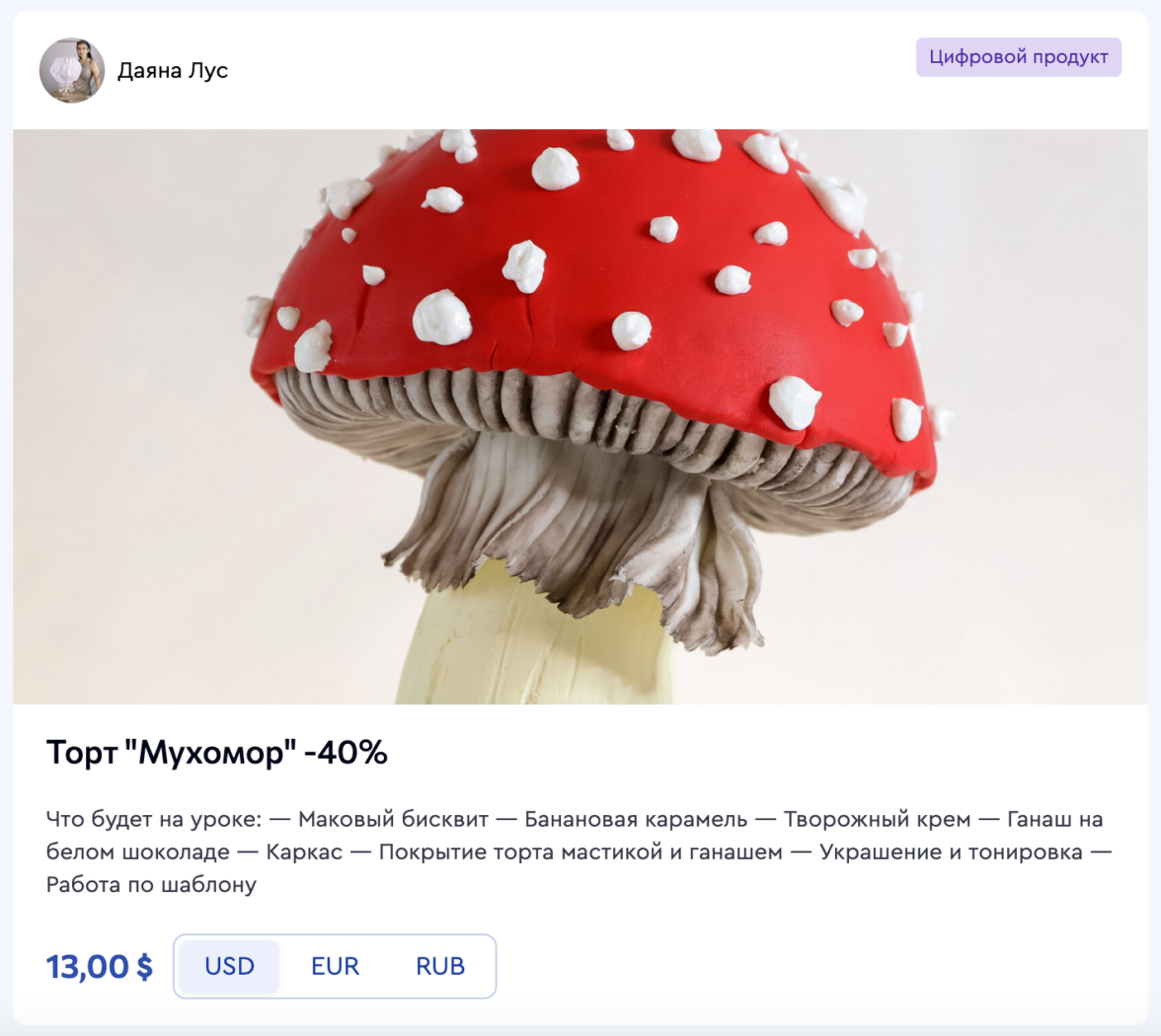 Вы можете создавать и делиться материалами, которые помогут передать ваш личный опыт и знания. Например, книги, чек-листы, гайды, пресеты, методички, рабочие тетради и другие тематические продукты.