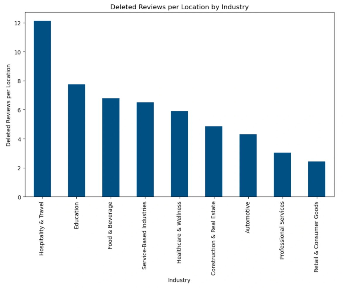 Чаще всего Google удаляет отзывы в категории «Индустрия гостеприимства и путешествия» (обзоры гостиниц, туристических услуг и мероприятий). На втором месте — «Образование» (рассказы об учреждениях и службах, занимающиеся обучением), на третьем — «Еда и напитки» (обзоры предприятий общественного питания, таких как рестораны или кафе).