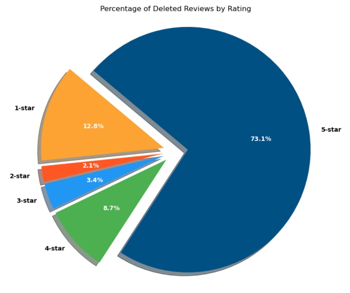 Круговая диаграмма показывает распределение удаленных отзывов по рейтингу. Подавляющее большинство из них (73,1%) были пятизвездочными отзывами (максимальная оценка), на втором месте (12,8%) — однозвездочные отзывы (минимальная оценка).