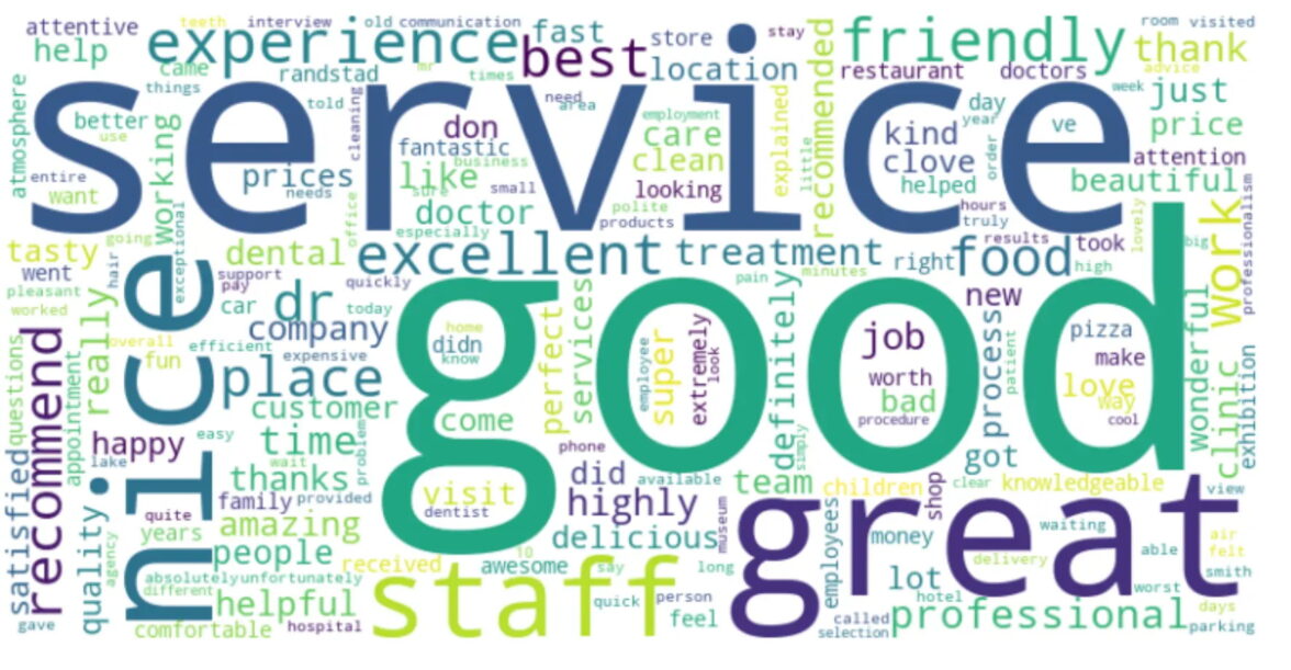 Что касается ключевых слов, которые наиболее часто встречаются в удаленных отзывах, то авторы исследование создали графическое облако слов, привлекающих наибольшее внимание программ-модераторов Google. Состав этой подборки полностью подтвердил вывод исследователей о том, что большинство удаленных отзывов — пятизвездочные: облако состоит из слов «великолепно», «хорошо», «восхитительно», «обслуживание», «персонал», «рекомендую» и так далее. Как правило, все они регулярно встречаются в тексте крайне положительных отзывов.