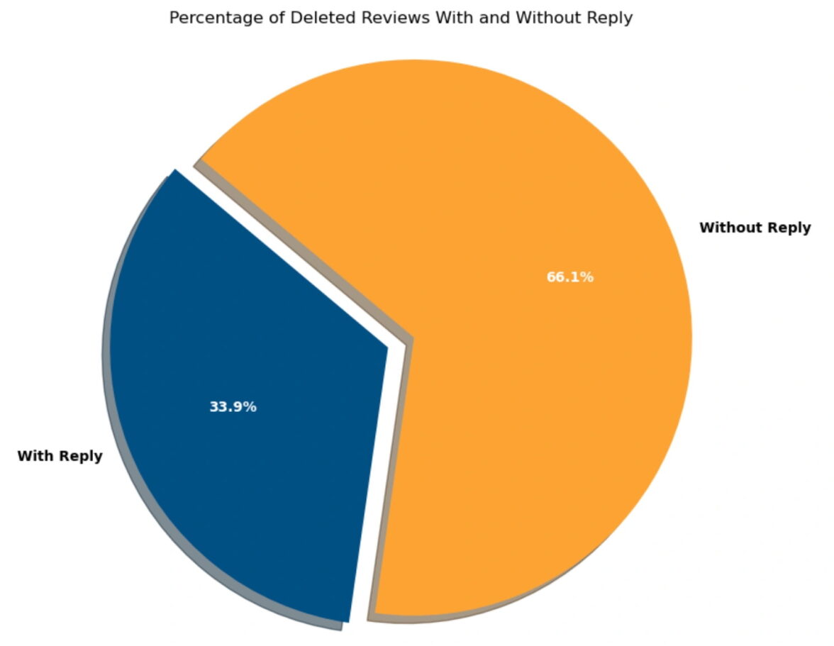 Собранные данные показывают, что 66,1% удаленных отзывов не имели ответов от бизнеса, который они хвалили или критиковали, а 33,9% — имели. Это говорит о том, что взаимодействие с рецензентами может помочь снизить вероятность удаления отзыва. Однако ответы как таковые не могут служить надежной защитой от удаления, считают в GMBapi.com: алгоритмы Google, похоже, больше сосредоточены на оценке качества и подлинности самого контента отзывов.