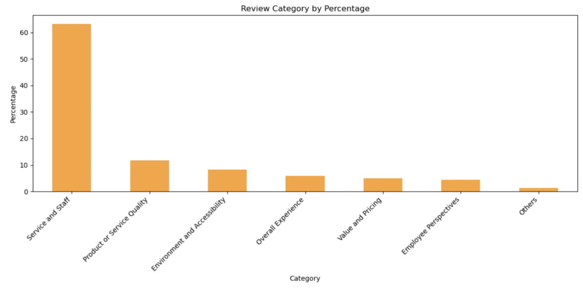Среди удаленных лидируют категории «Обслуживание и персонал» (комментарии о качестве обслуживания клиентов, дружелюбии персонала, опыте или отзывчивости), за ними следуют «Качество продукта или услуги» (качество, надежность и производительность предлагаемых продуктов или услуг) и «Окружающая среда и доступность» (чистота, атмосфера, местоположение, удобство и доступность).