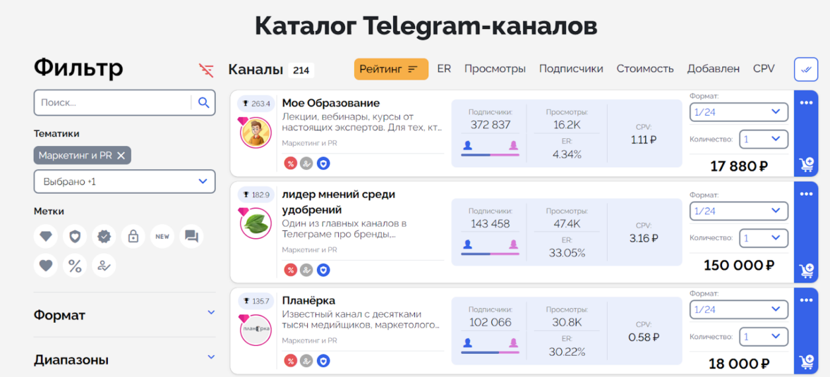 Есть разные рекламные биржи — например, Telega.in. С помощью биржи можно быстро подобрать каналы по тематике, не тратить время у администраторов стоимость и оценку рисков: на сайте обычно есть отзывы, а деньги в случае неоплаты вам вернутся на карту. Но на бирже цены обычно завышены, многих каналов нет, а сама биржа еще и берет комиссию в 10–15%.