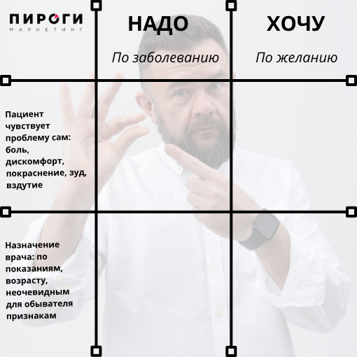 Диагностирует сам — это когда человек сам осознает проблему (например, боль в зубе или геморрой). В этом случае главное донести до пациента информацию о том, что вы предлагаете соответствующие услуги.