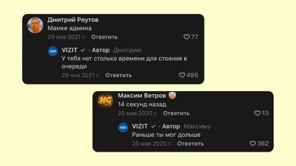 VIZIT шутит над подписчиками в комментах, иногда даже оскорбляет, но судя по лайкам на комментах, читателям это нравится.